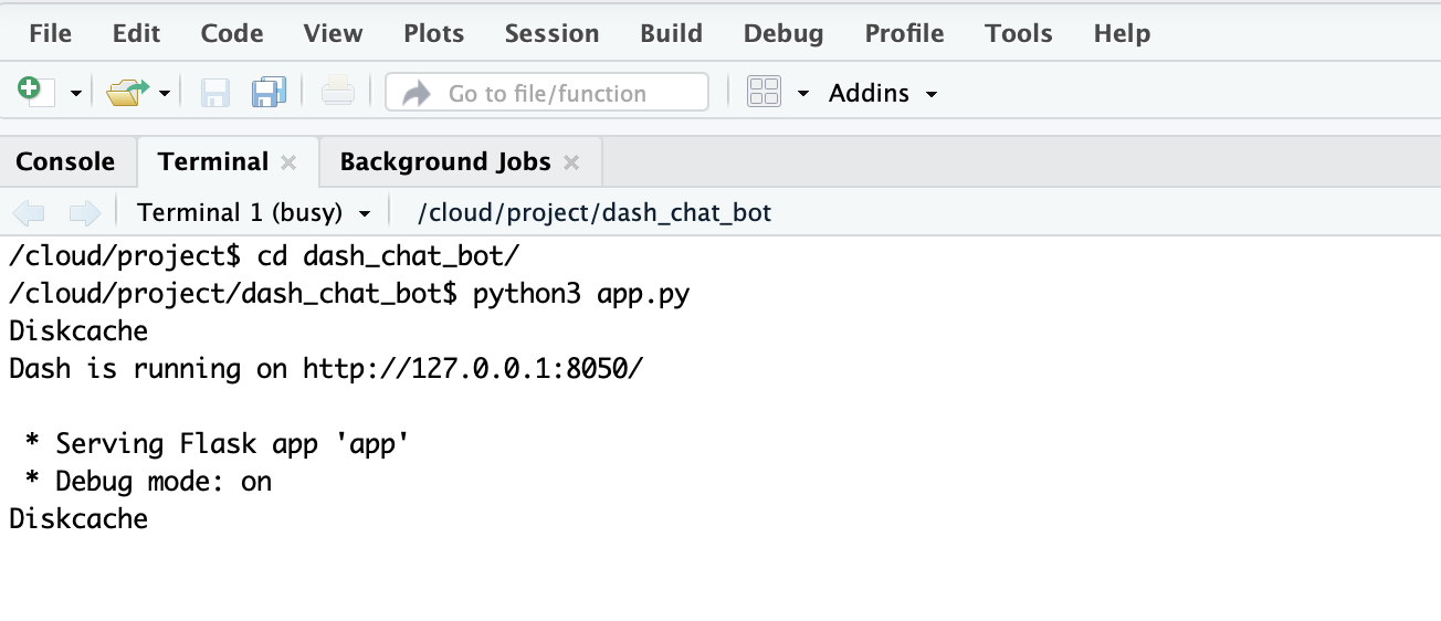 You will not be able to visit the app before deploying, but you can still make sure it works. Run the commands below from the dash_chat_bot folder once you have created the necessary files.
